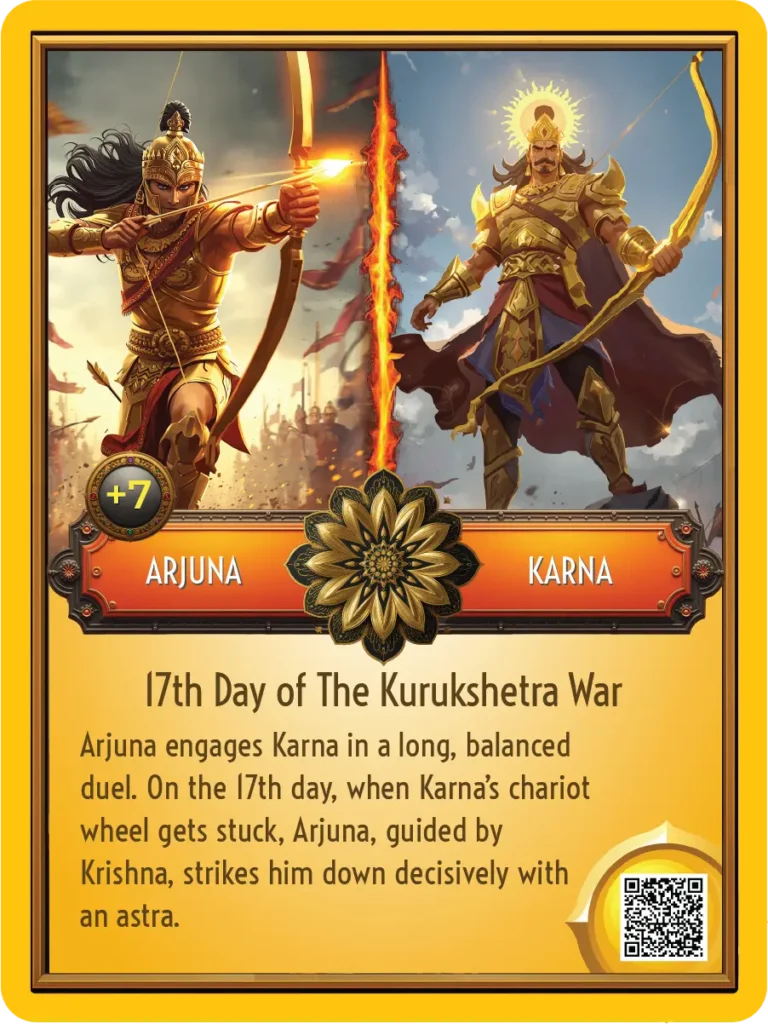 • Example: Event cards often give situational bonuses (e.g., Bhima vs Duryodhana gives +7 LP to Bhima). Players must evaluate whether to risk fighting or forfeit the event.